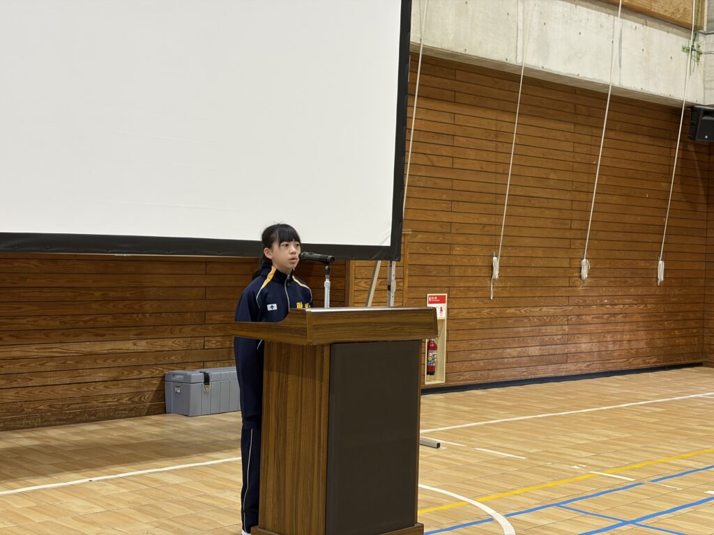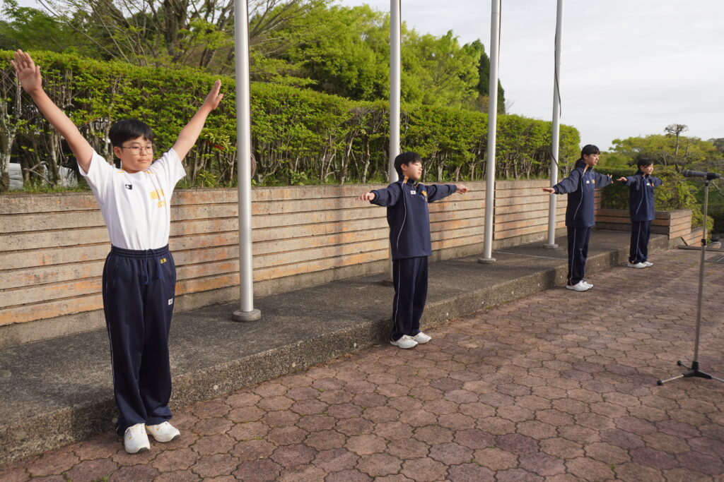 朝の体操 吉川 陽向さん(宮崎南小出身)、吉原 和成さん(赤江小出身)、戸髙愛友さん(大久保小出身)、前田一華さん(小松台小出身)