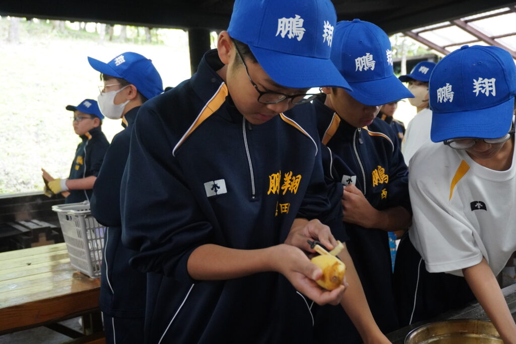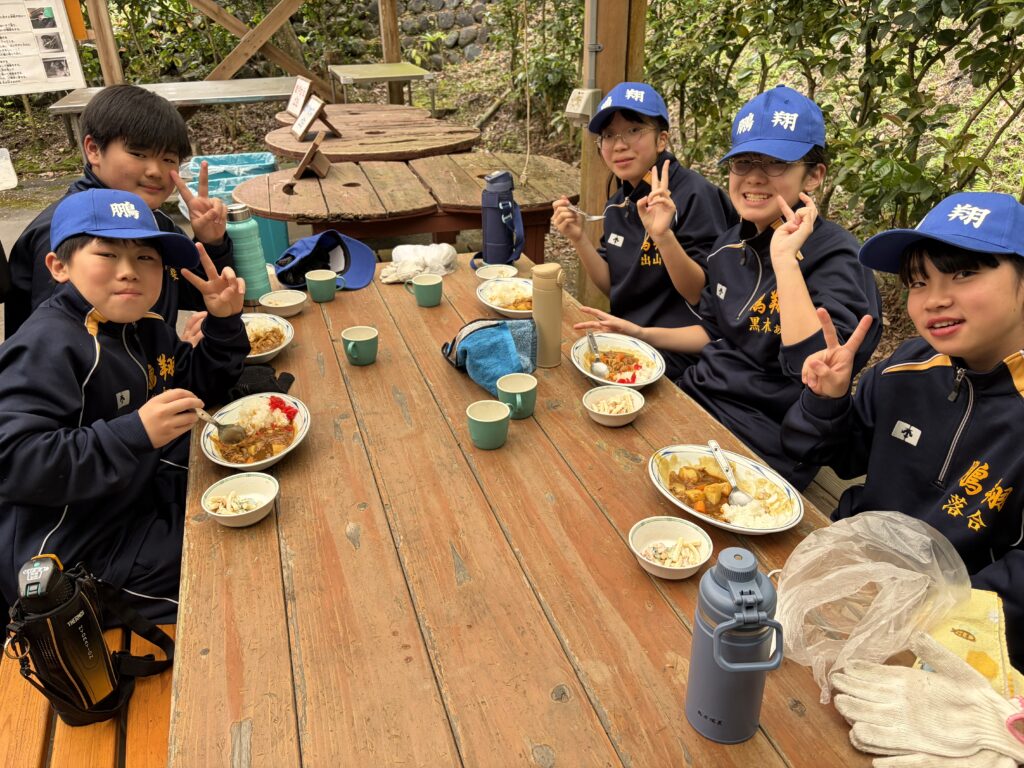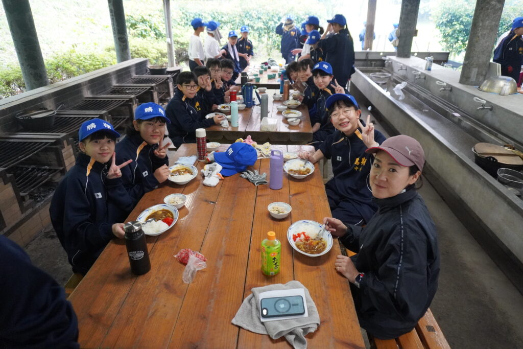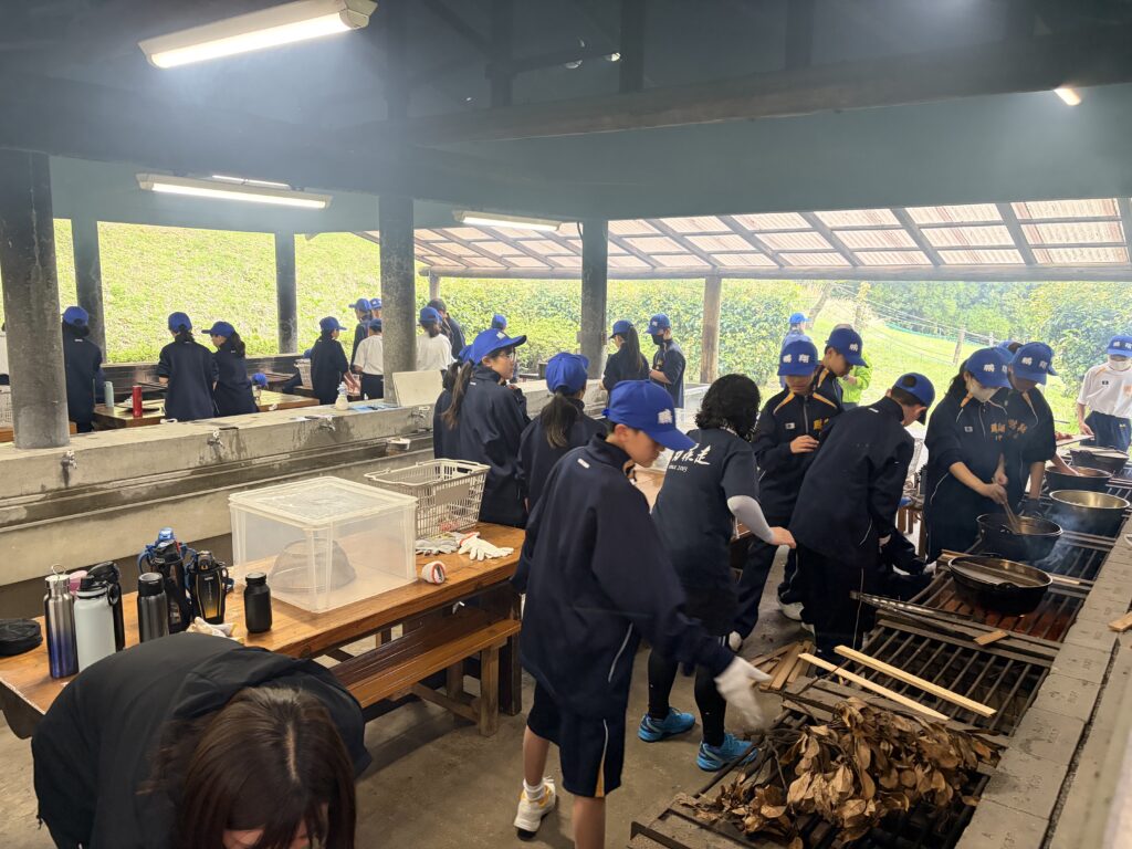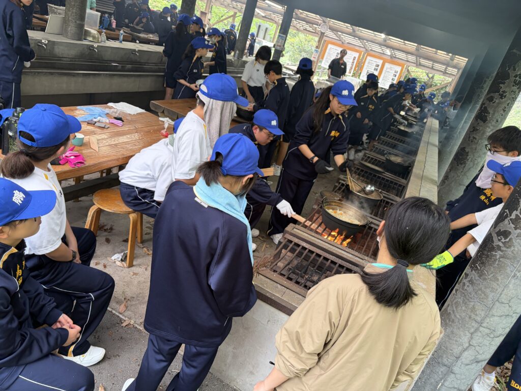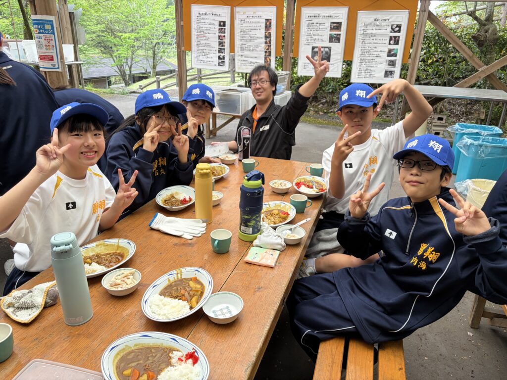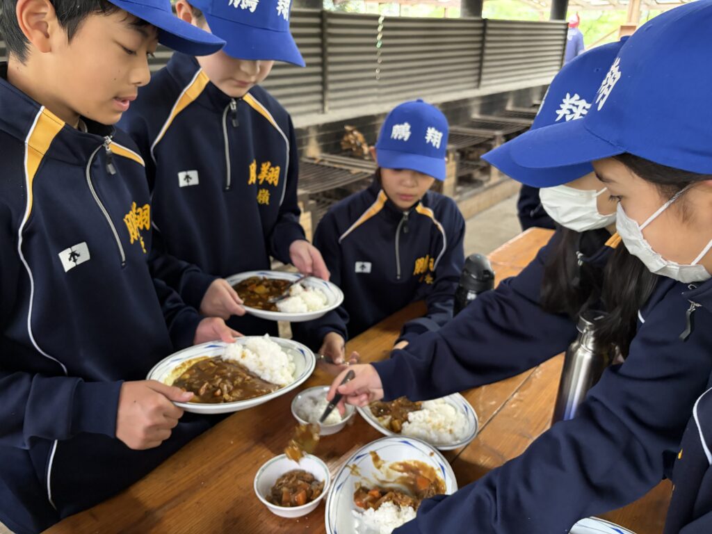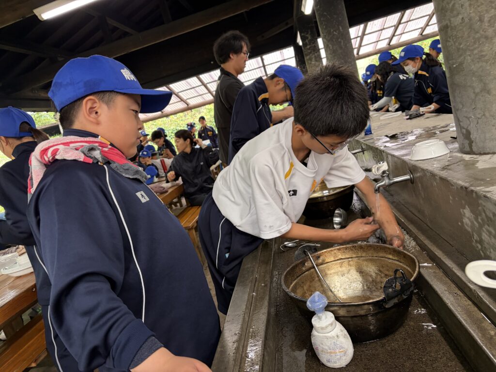 朝食後、お世話になったお部屋の清掃・荷物の整理をし、楽しみにしていた野外炊飯災害カレー作りの時間です‼︎火おこしから後片付けまで、班のみんなで協力して災害カレーを作りました。
