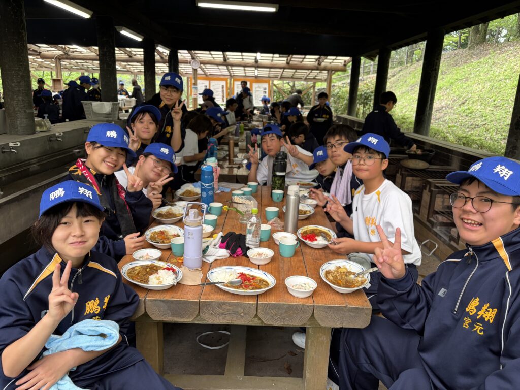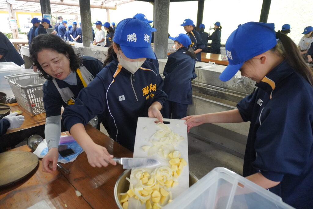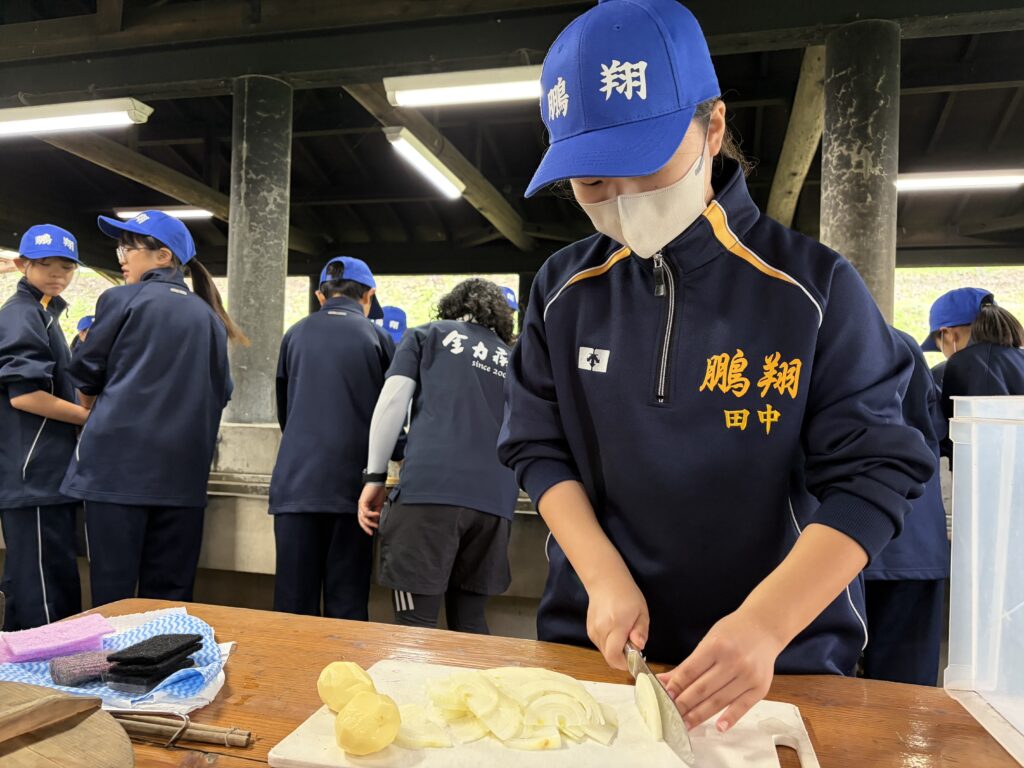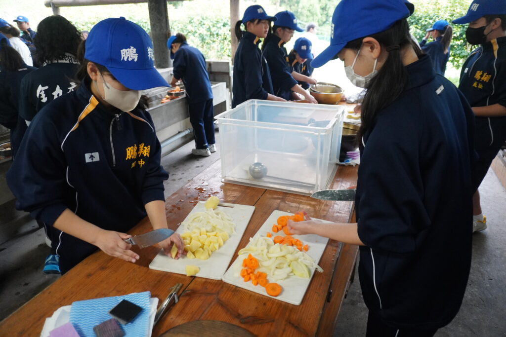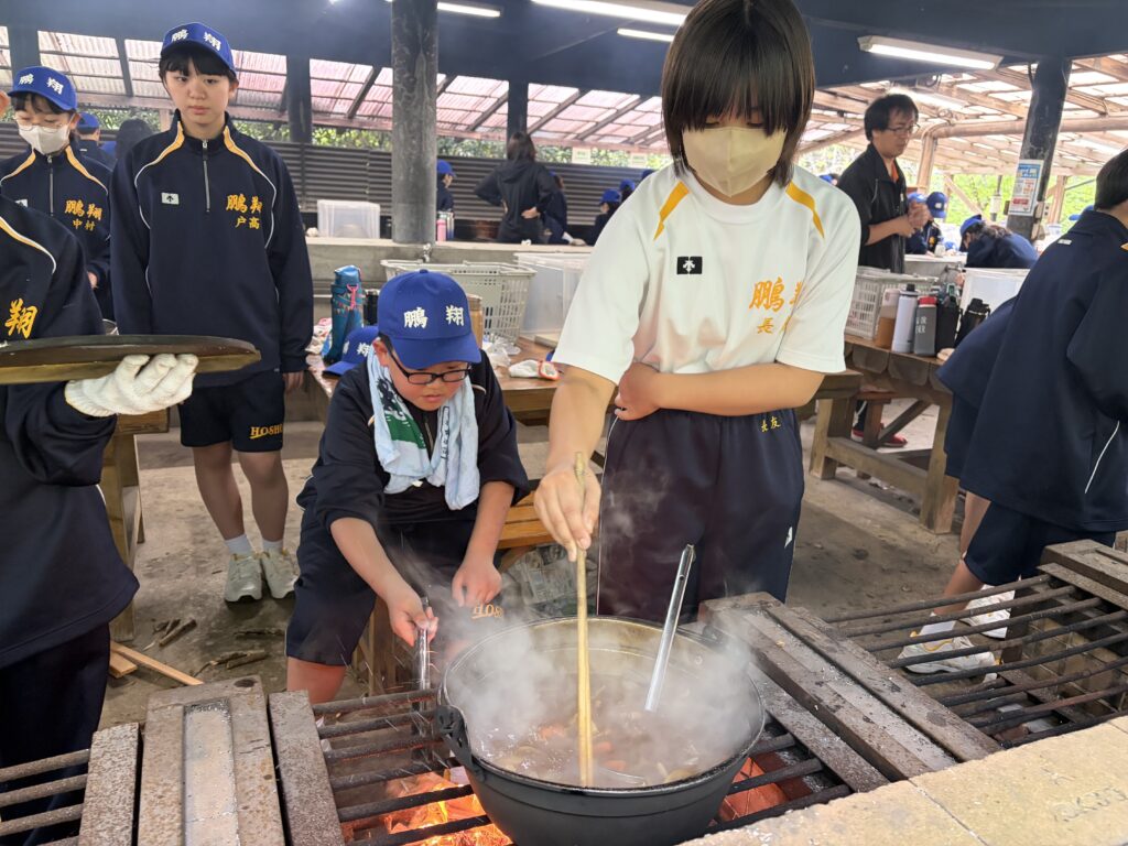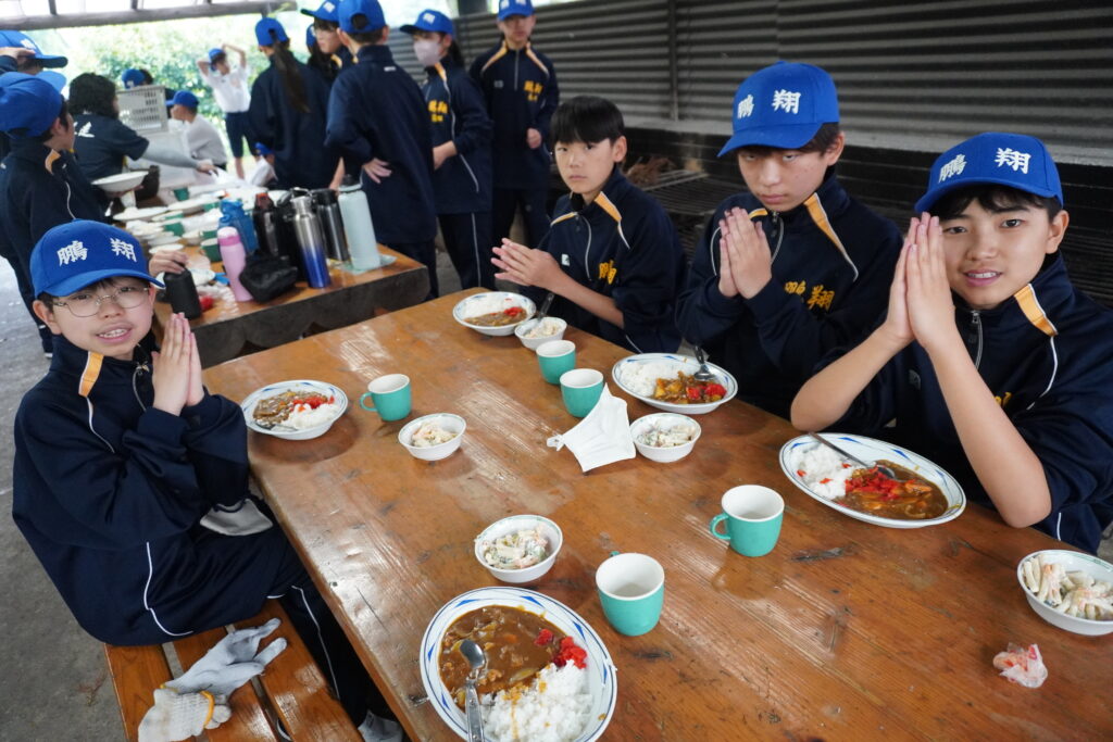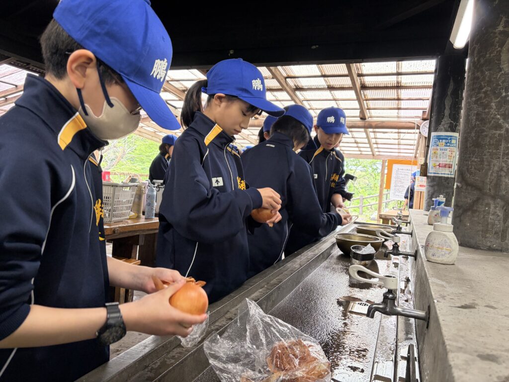 朝食後、お世話になったお部屋の清掃・荷物の整理をし、楽しみにしていた野外炊飯災害カレー作りの時間です‼︎火おこしから後片付けまで、班のみんなで協力して災害カレーを作りました。