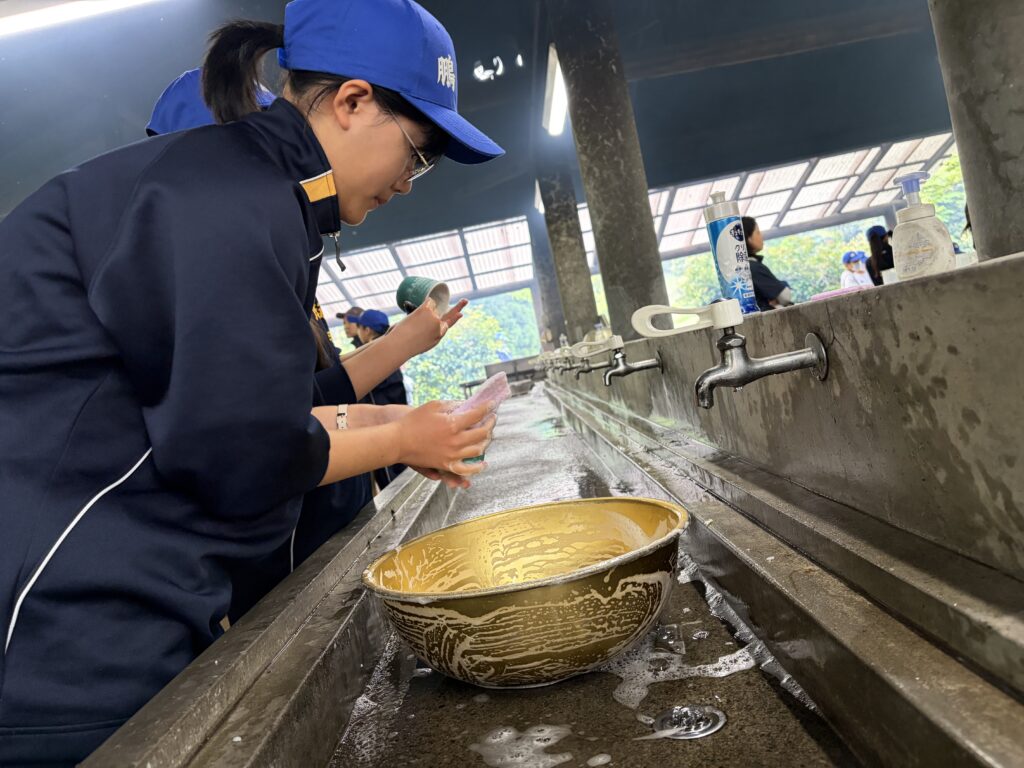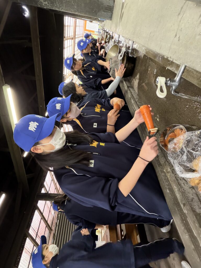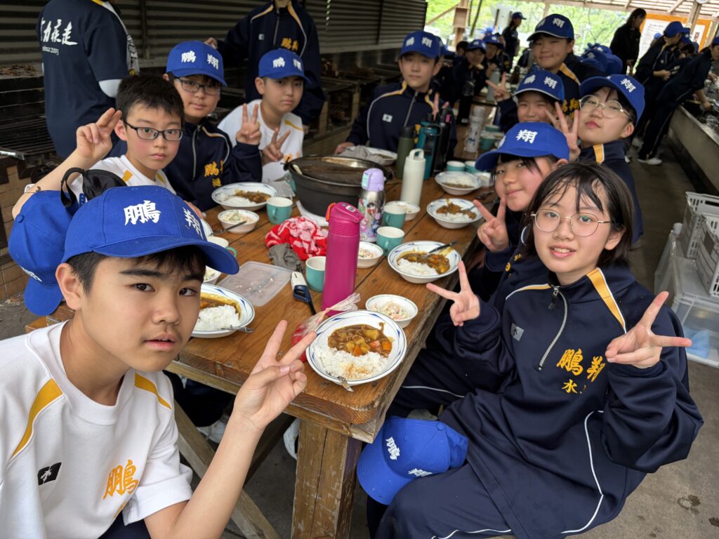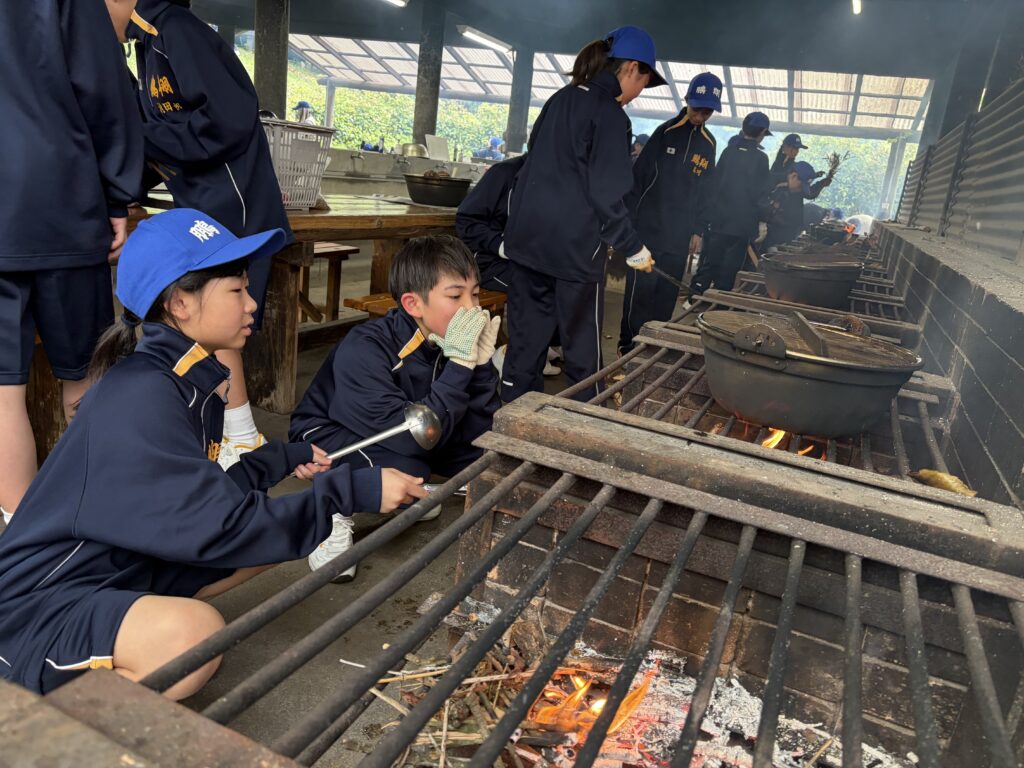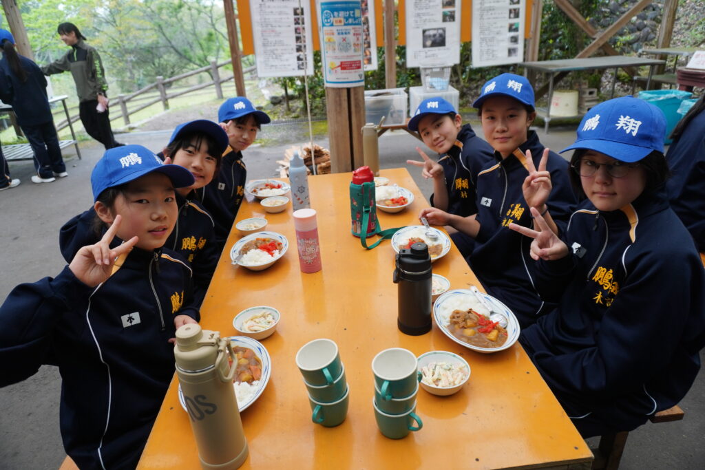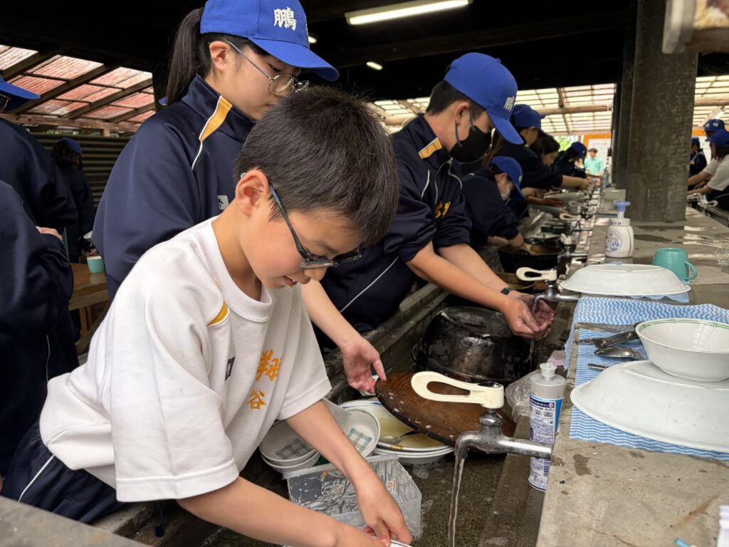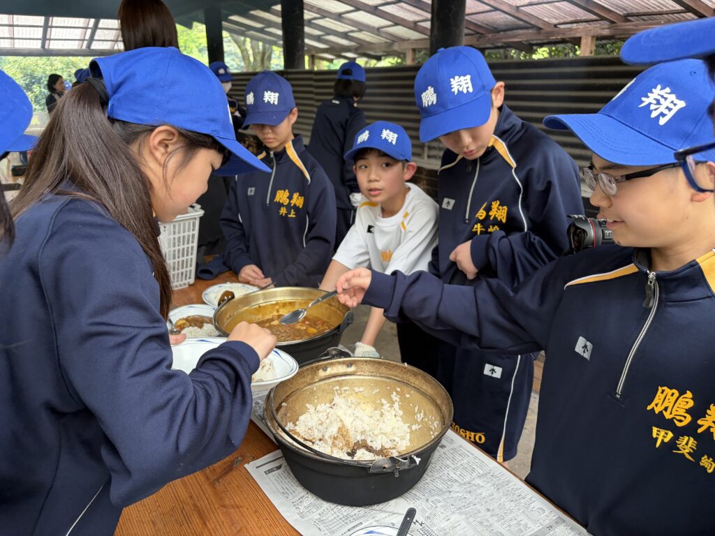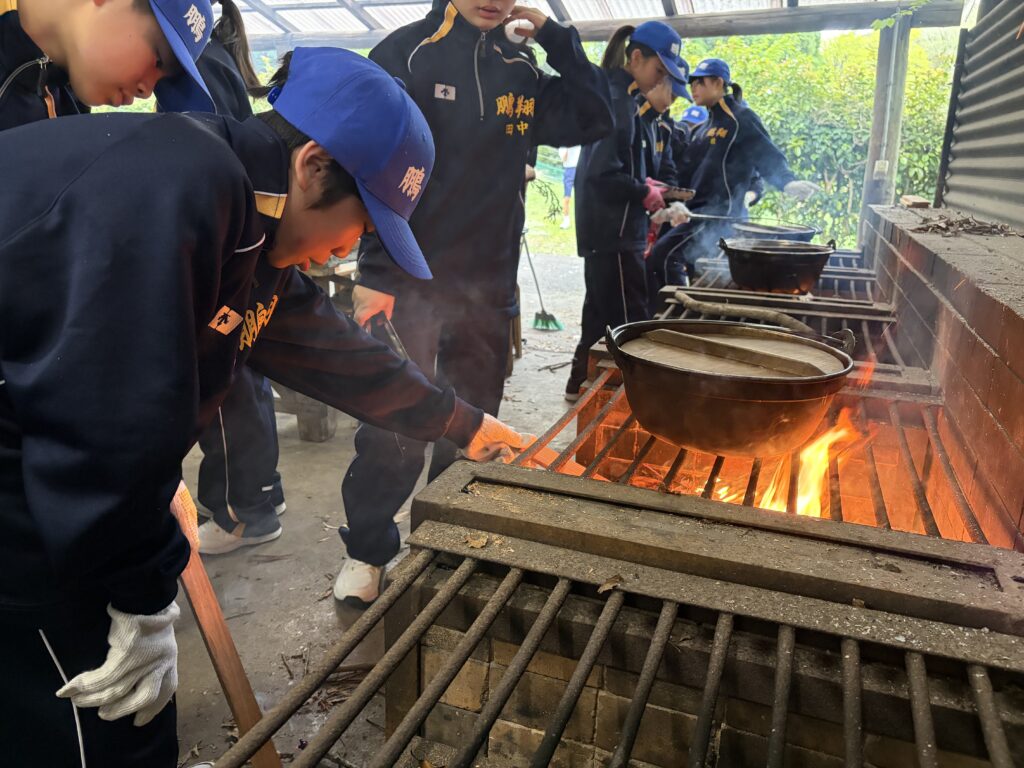 朝食後、お世話になったお部屋の清掃・荷物の整理をし、楽しみにしていた野外炊飯災害カレー作りの時間です‼︎火おこしから後片付けまで、班のみんなで協力して災害カレーを作りました。
