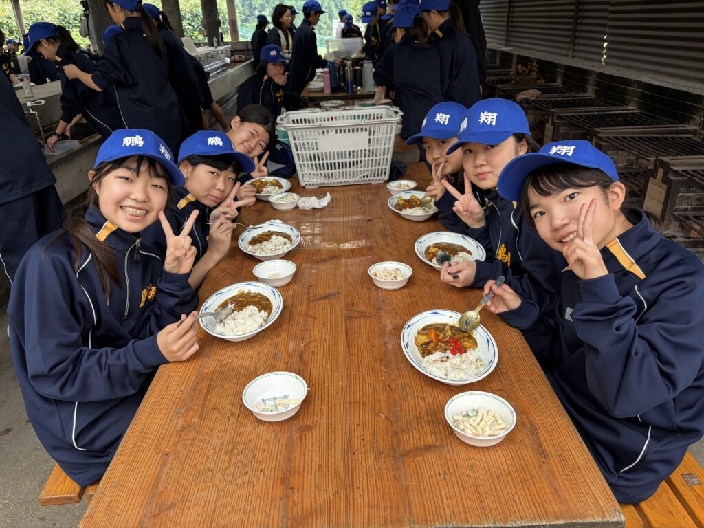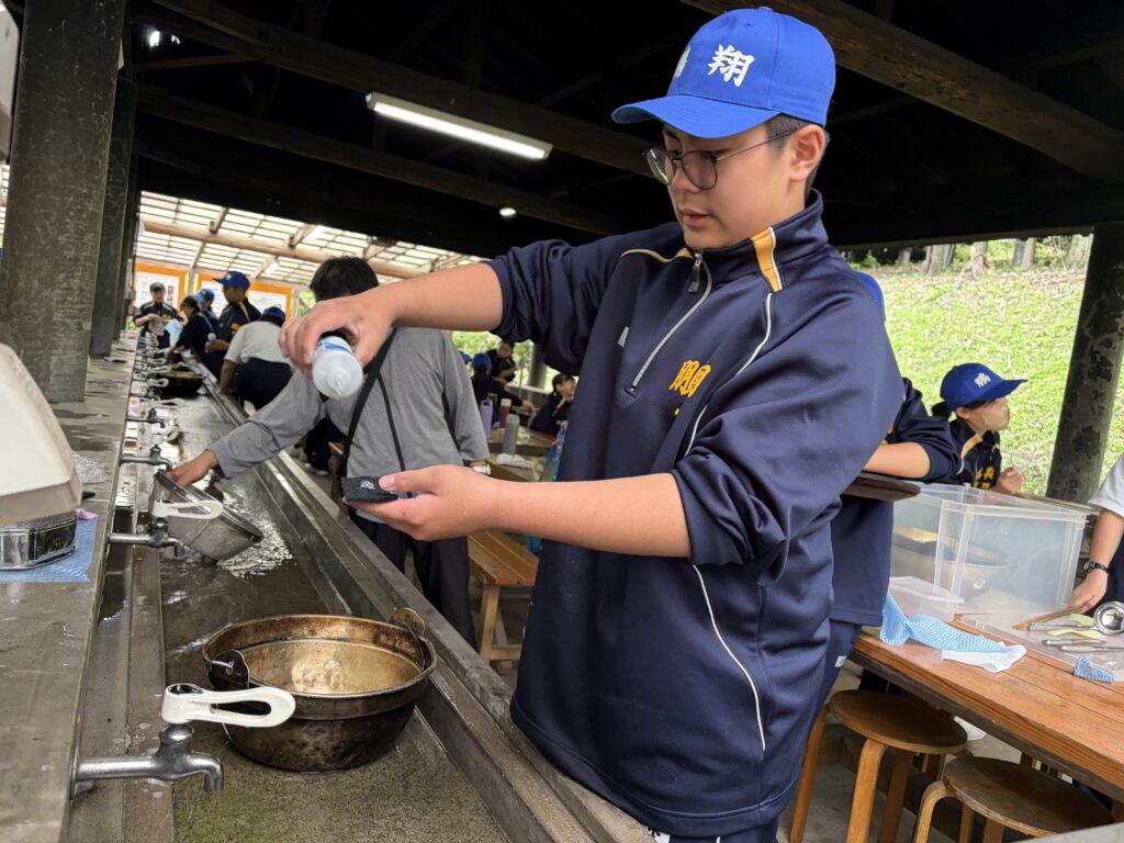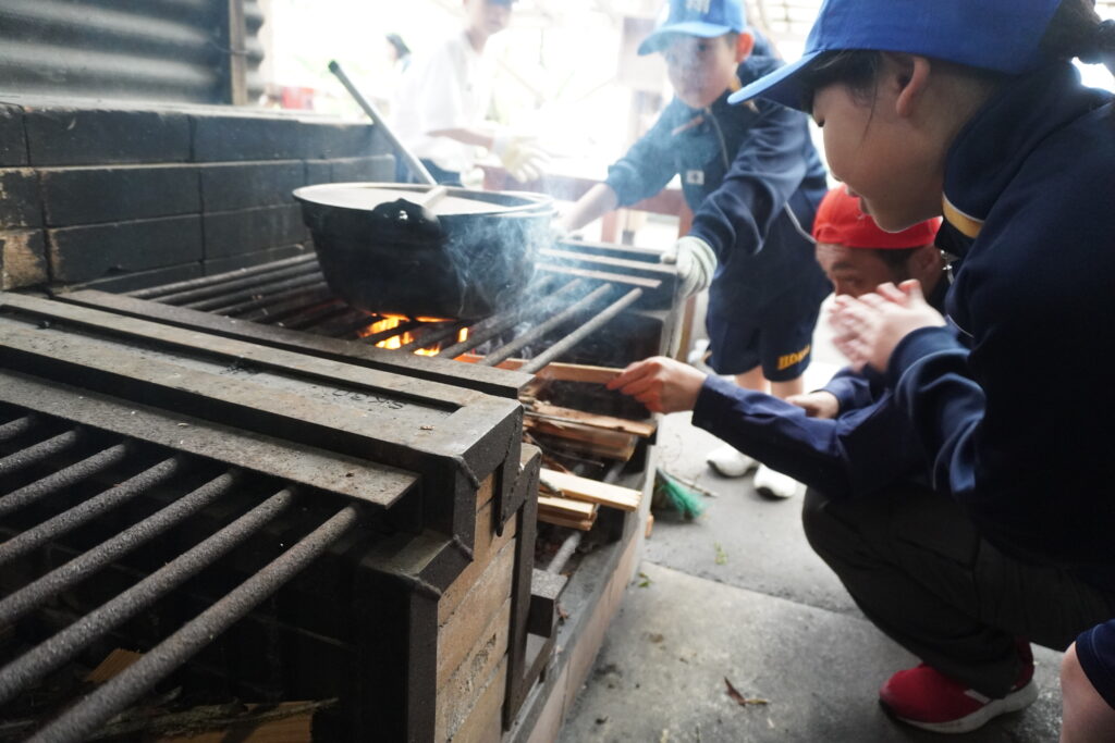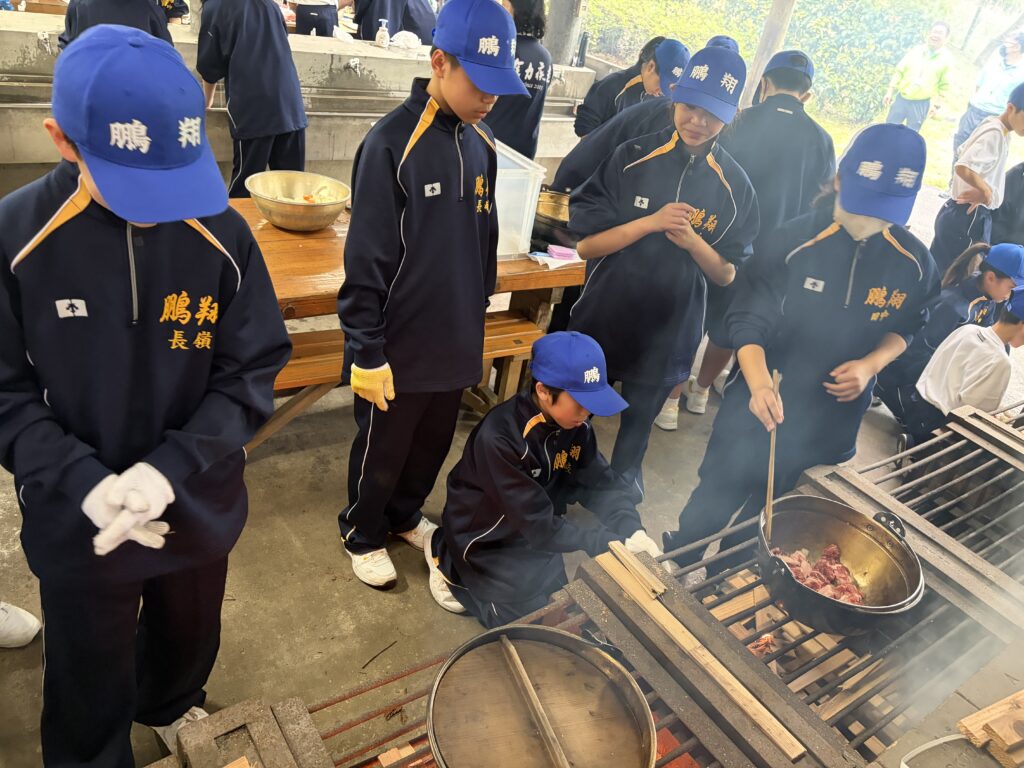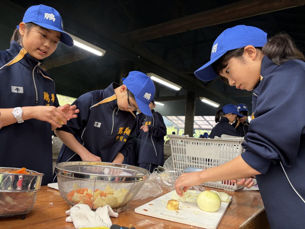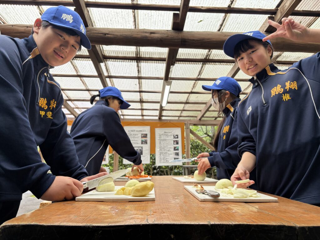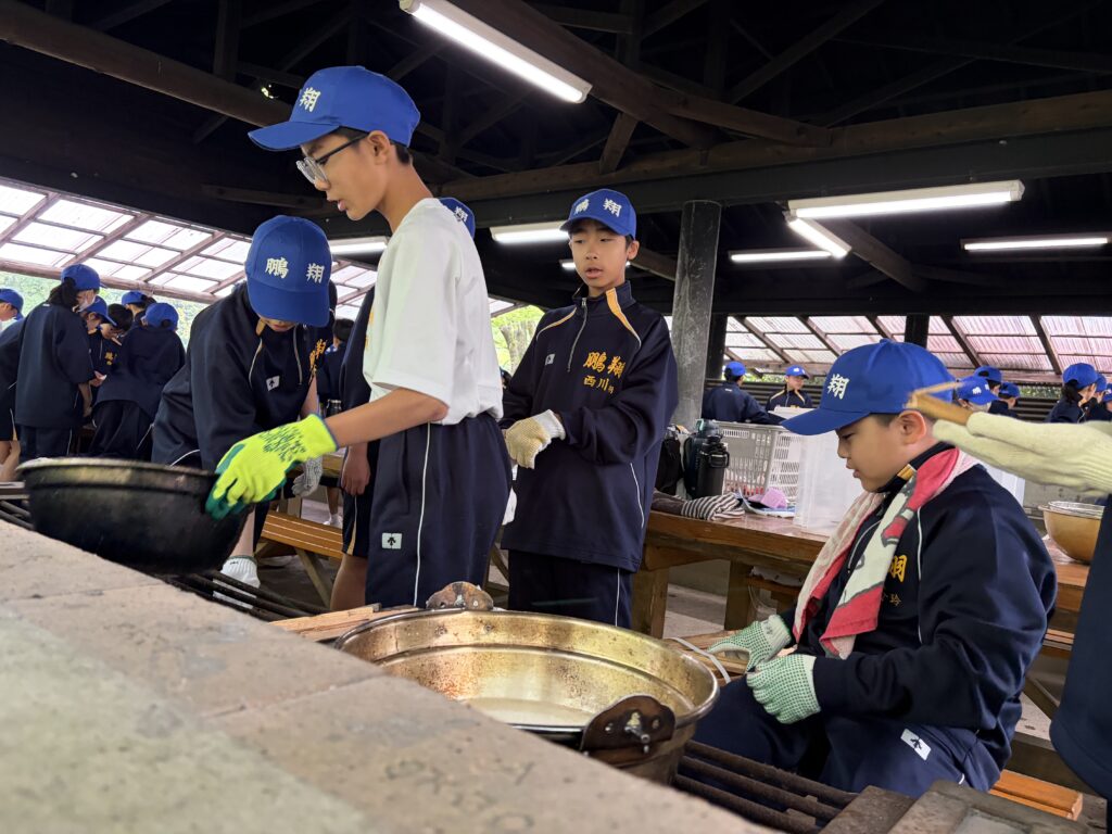 朝食後、お世話になったお部屋の清掃・荷物の整理をし、楽しみにしていた野外炊飯災害カレー作りの時間です‼︎火おこしから後片付けまで、班のみんなで協力して災害カレーを作りました。