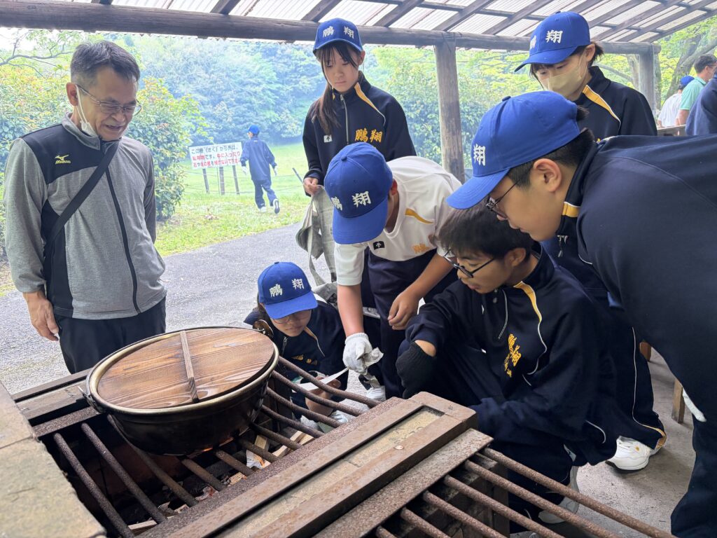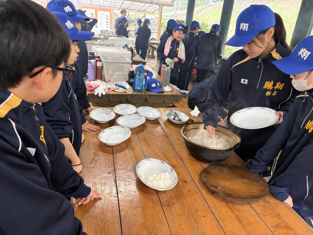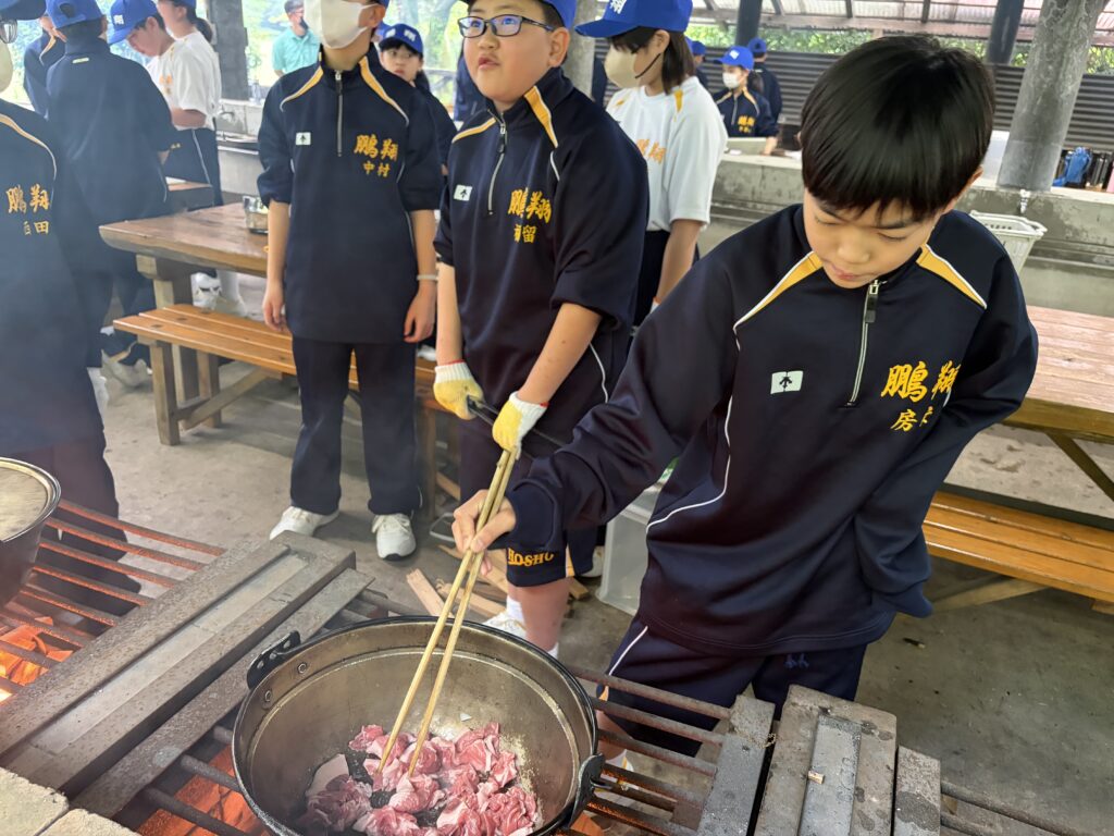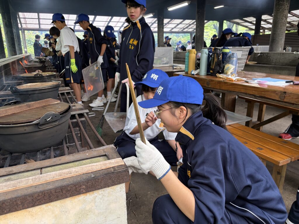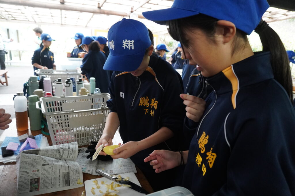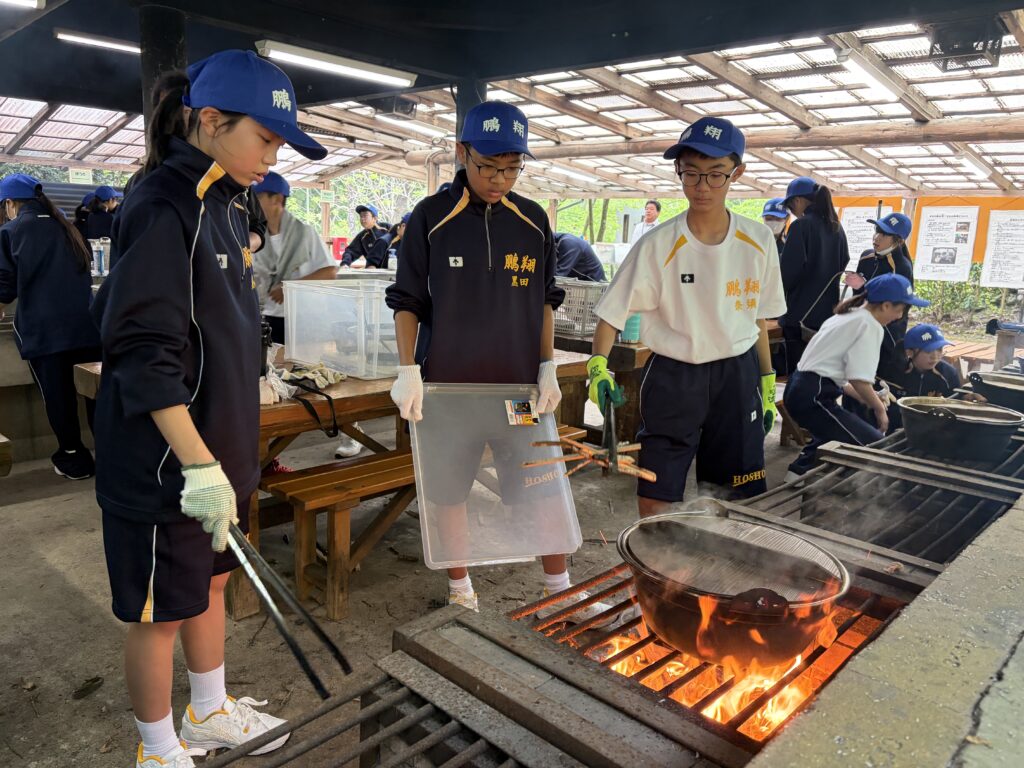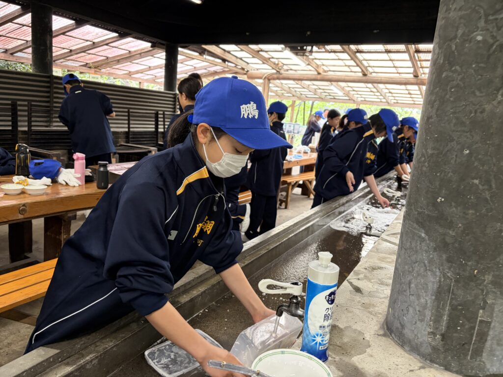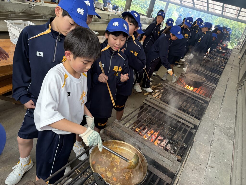朝食後、お世話になったお部屋の清掃・荷物の整理をし、楽しみにしていた野外炊飯災害カレー作りの時間です‼︎火おこしから後片付けまで、班のみんなで協力して災害カレーを作りました。