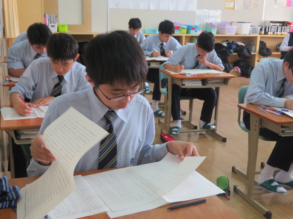 休み時間や自学の時間に様子を見に行ったところ、休み時間を利用し、友人と確認をしたり、自学中もまとめたノートを机に広げて学習したりと、テストに臨む立派な姿勢が見れました。