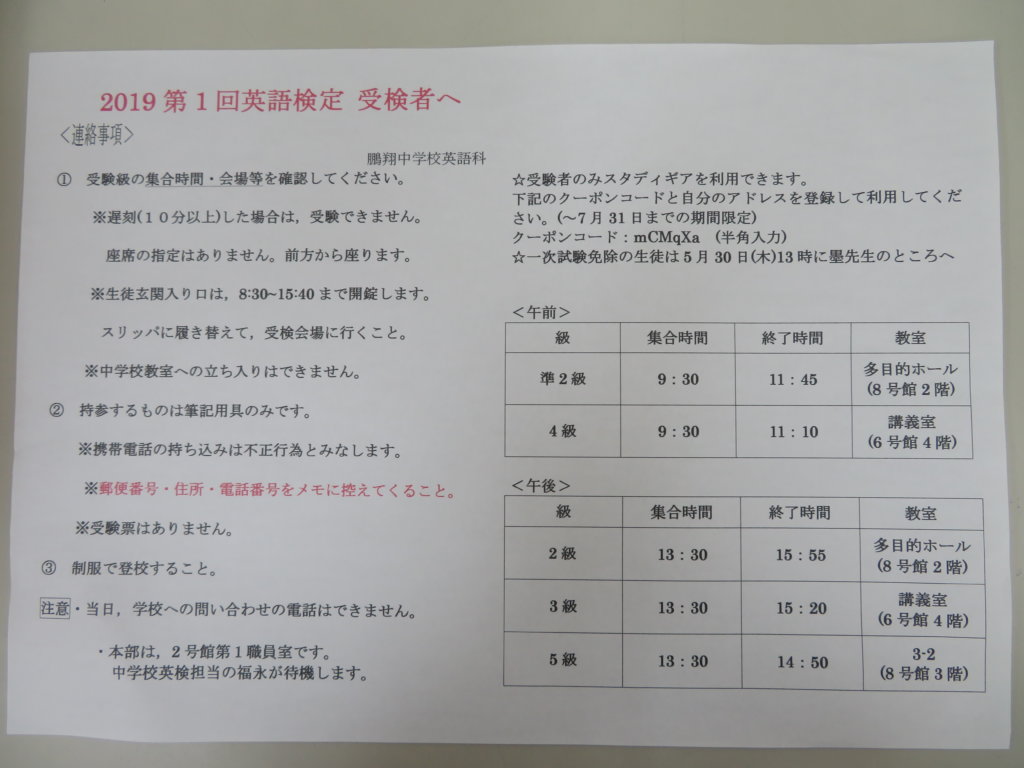 6月2日(日)に第1回実用英語技能検定が本校で行われます。