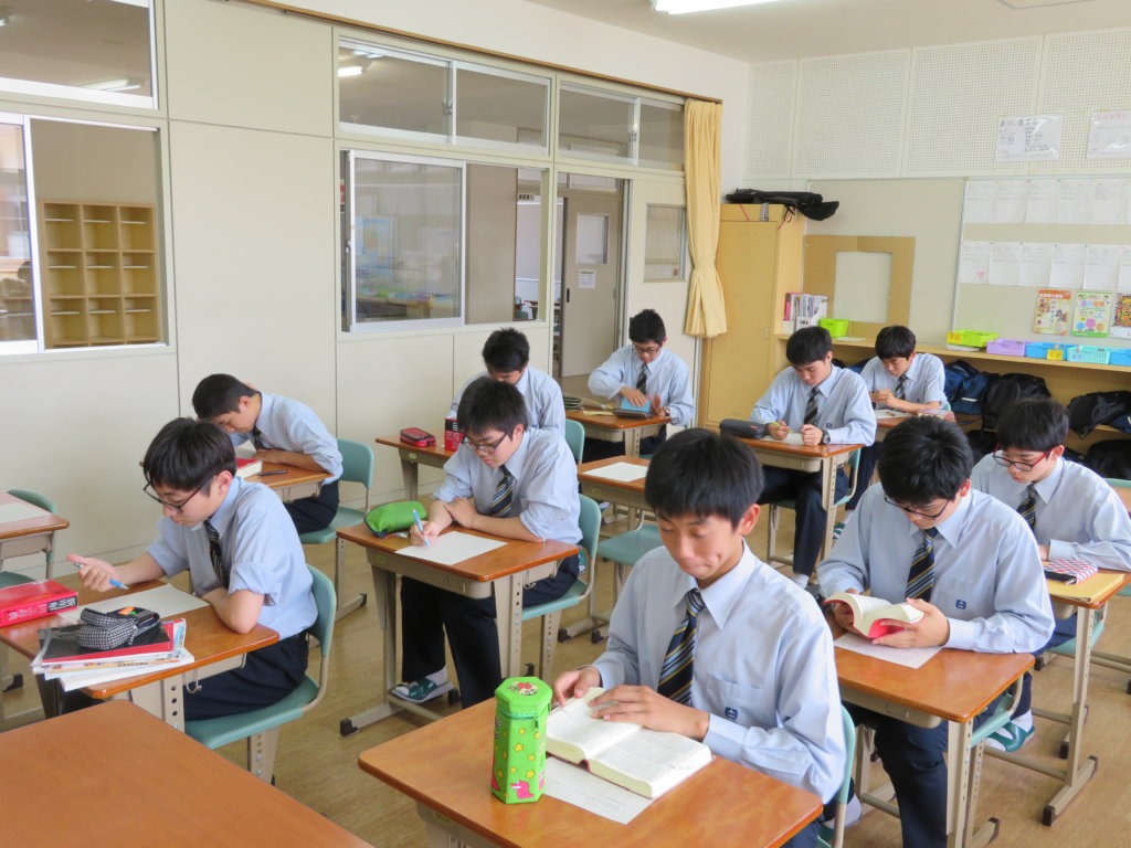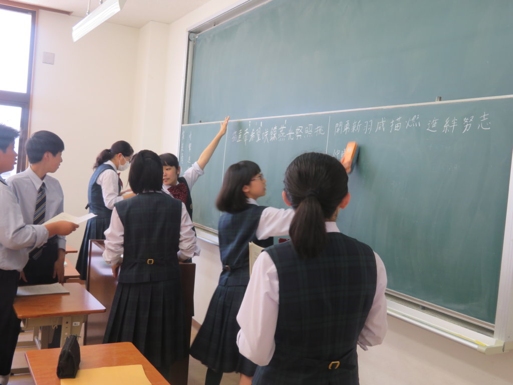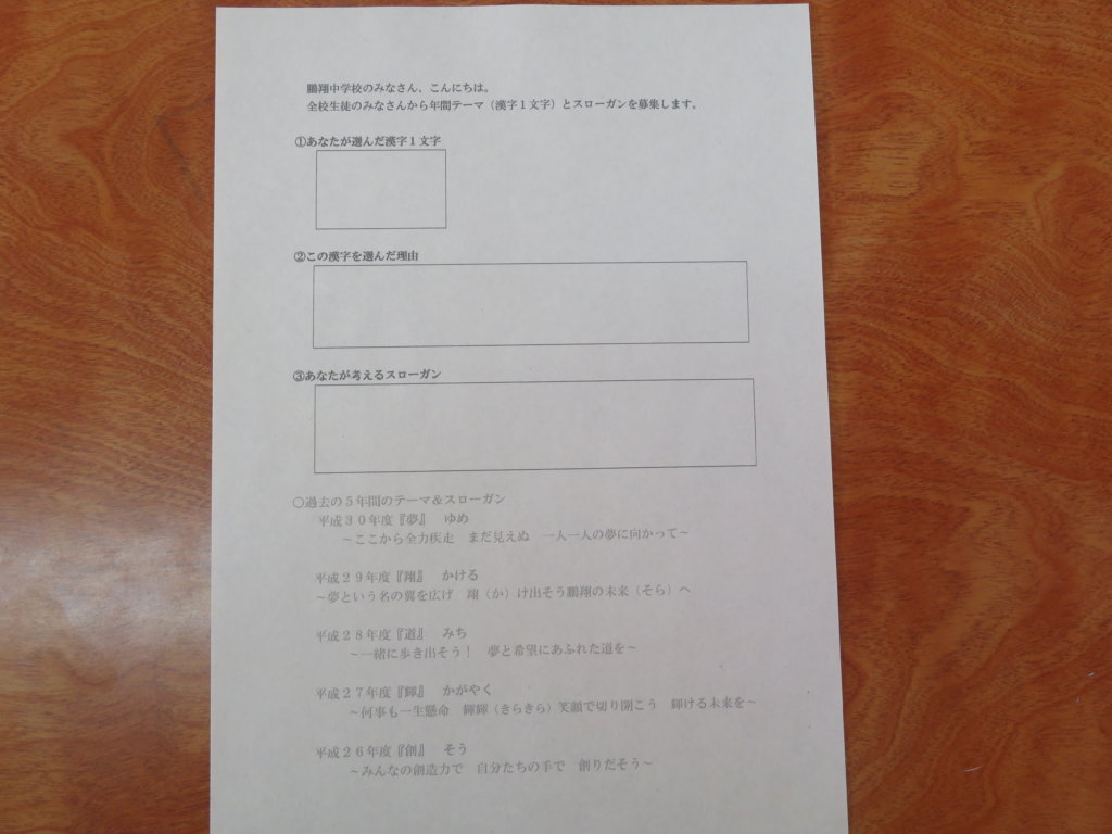 今日は年間スローガン&テーマを決めを行いました。生徒会役員のメンバーがそれぞれのクラスで説明を行い、その後、今回のテーマを考えました。漢字に込めた思いや、今後どのような学校にしたいかを一人一人が考えました。今年のスローガン発表までもうしばらくお待ちください!