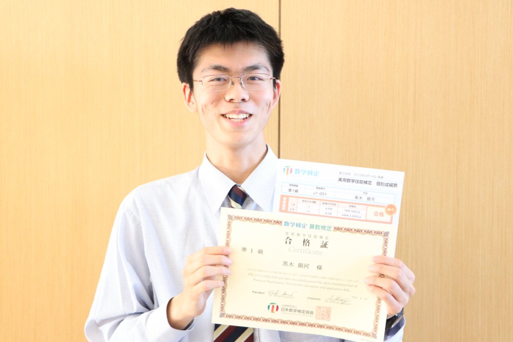 また、中高一貫の2年1組の黒木銀河君が、数学検定の準1級に満点で合格をしました。
