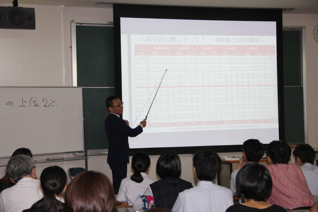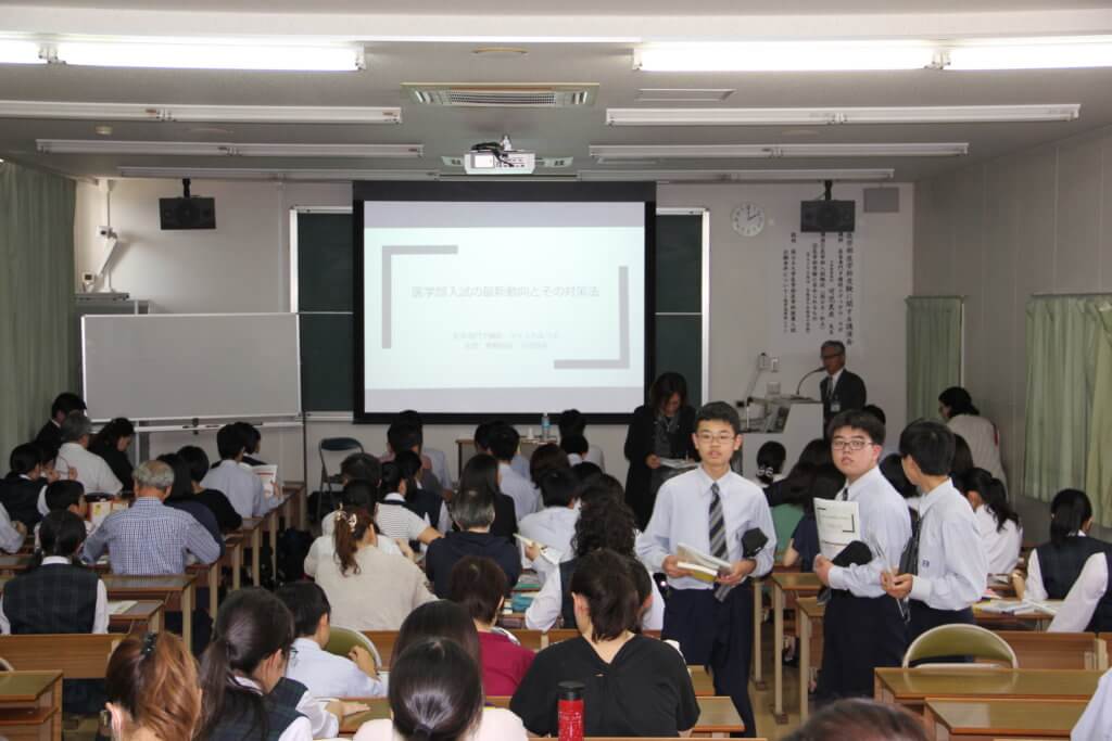 医学部医学科の受験に関心を抱く特進英数科生及び中学生を対象とした今講演。案内を配付した翌日以降、参加希望者が多く、当日まで参加希望者がいた関係上、座席を拡充するほどの参加者。