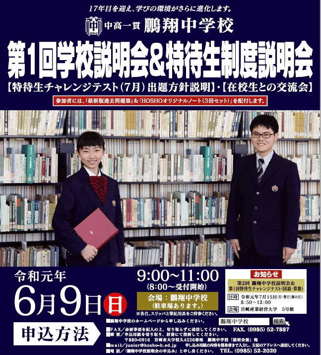 6月9日(日)に「鵬翔中学校第1回学校説明会&特待生制度説明会」を行います。