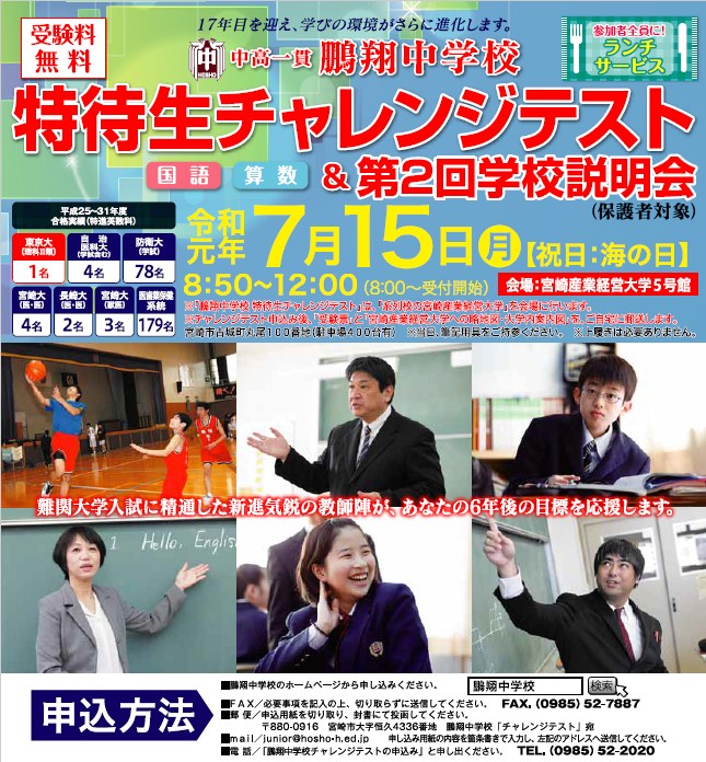 次は、7月15日(月・祝)に第1回特待生チャレンジテスト&第2回学校説明会を行います。申し込みを本校ホームページトップより受け付けておりますので、ぜひご参加ください。