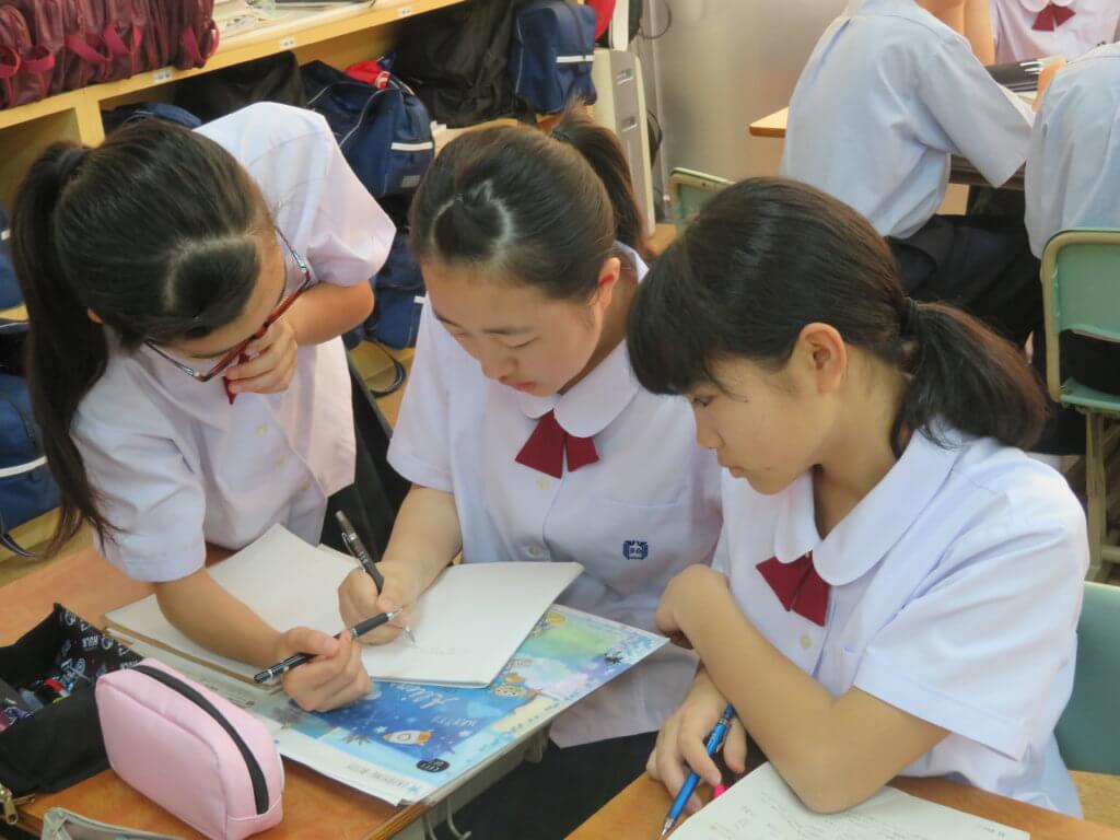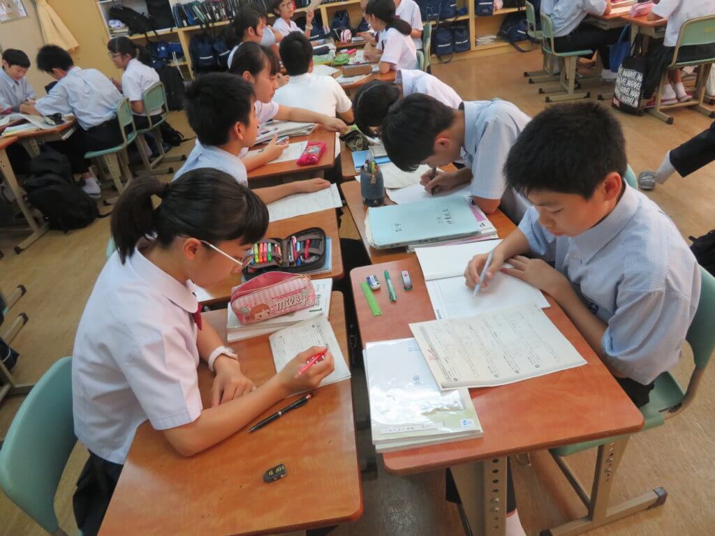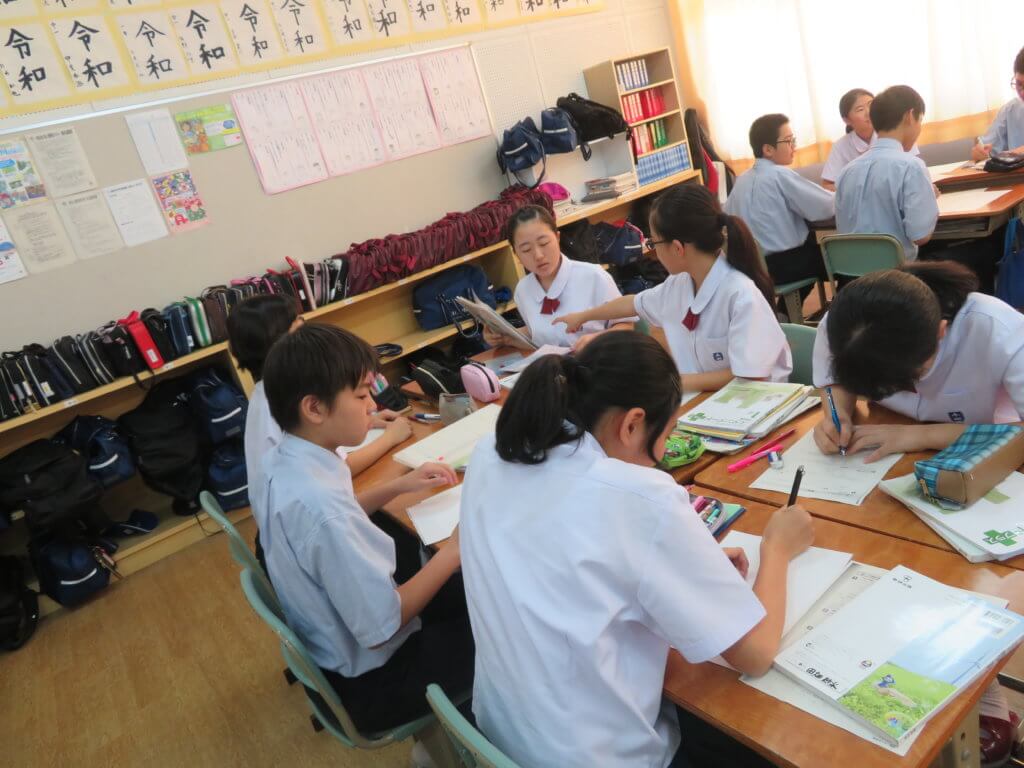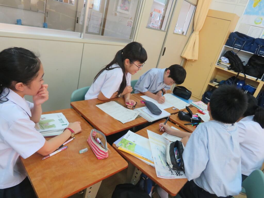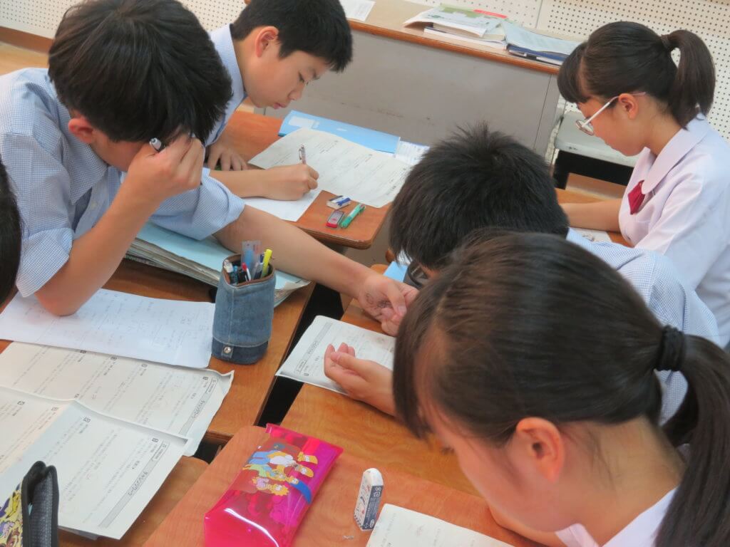昨日出した課題の模範解答を班ごとに協力して作り、全員が理解できるように教え合いをするのが目標です。