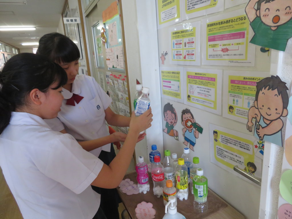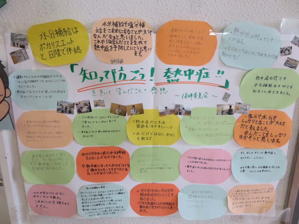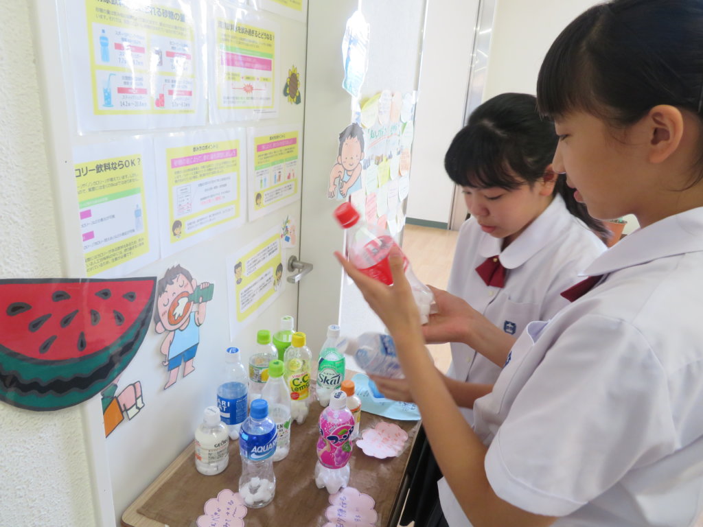 また、保健室前には、糖分を示した飲み物や熱中症予防講座の感想などが掲示してあり、友達と話をしながら見ているようです。