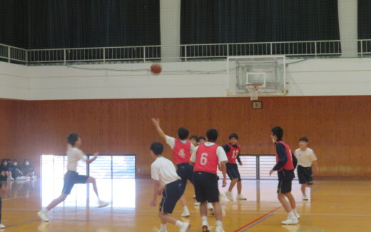 今日の体育の時間J2生はバスケットボールを行っていました。これまでの体育の時間で基本的な動きなどを学んできました。今日はこれまでの練習を活かして試合を行っていました。クラス混合でチームを組み、試合を行いました。 チー