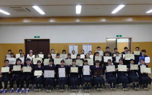 第13回青の國若山牧水短歌大会において、J3-A甲斐琴子さん(財光寺南小出身)、J3-B黒川芽生さん(宮崎南小出身)、 J3-A有山昂佑さん(江南小出身)が入賞し、優秀賞を受賞したJ3-B黒川芽生さんが表彰されました。