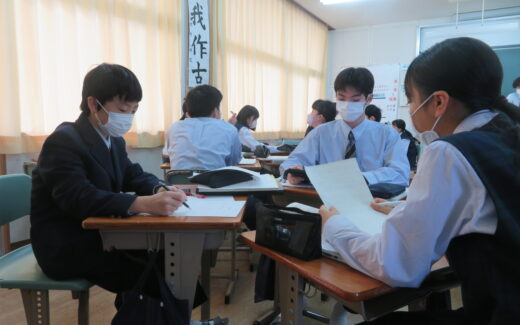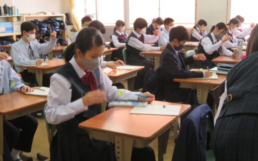 本日より、J3生は英語研修へ行っています。学校では、J2・J1生が学習しています。J1生は1限目、先週の土曜日に引き続き大学の学部研究を行っていました。 また、4限目の英語の時間はリスニングに挑戦していました。 J2生