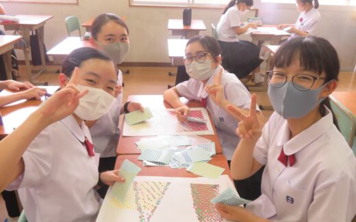 本日は、文化発表会の準備の様子を紹介します。 J2-Aは、なにやら小さいマスに小さなシールを黙々と貼っています。「モザイクアート」をするようです!どんなモザイクアートができあがるのか、当日楽しみにしていてください!